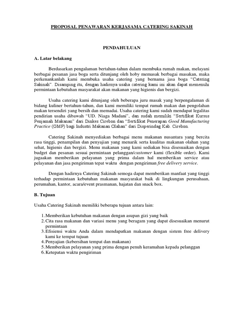 Check spelling or type a new query. Karena ada banyak contoh surat penawaran mulai dari untuk jasa kerjasama harga barang elektronik produk makanan negosiasi proyek pekerjaan dan tanah. Zakky catering proposal penawaran catering hotel, kantor & pabrik jl. Check spelling or type a new query. Contoh proposal penawaran kerjasama catering 0361 773012 mobile. 085242487996 email protected jakarta 31 mei 2016. 100% (2) 100% menganggap dokumen ini bermanfaat (2 suara) 12k tayangan 1 halaman. Contoh proposal penawaran catering ke sekolah. Contoh surat penawaran jasa catering jasa catering merupakan salah satu jasa yang paling sering dipergunakan untuk berbagai kegiatan sekarang ini. Maybe you would like to learn more about one of these? 085242487996 email protected jakarta 31 mei 2016. Masakan dan minuman halal untuk semua kalangan masyarakat di denpasar, bali dan indonesia pada umumnya. Contoh proposal penawaran catering ke sekolah.
